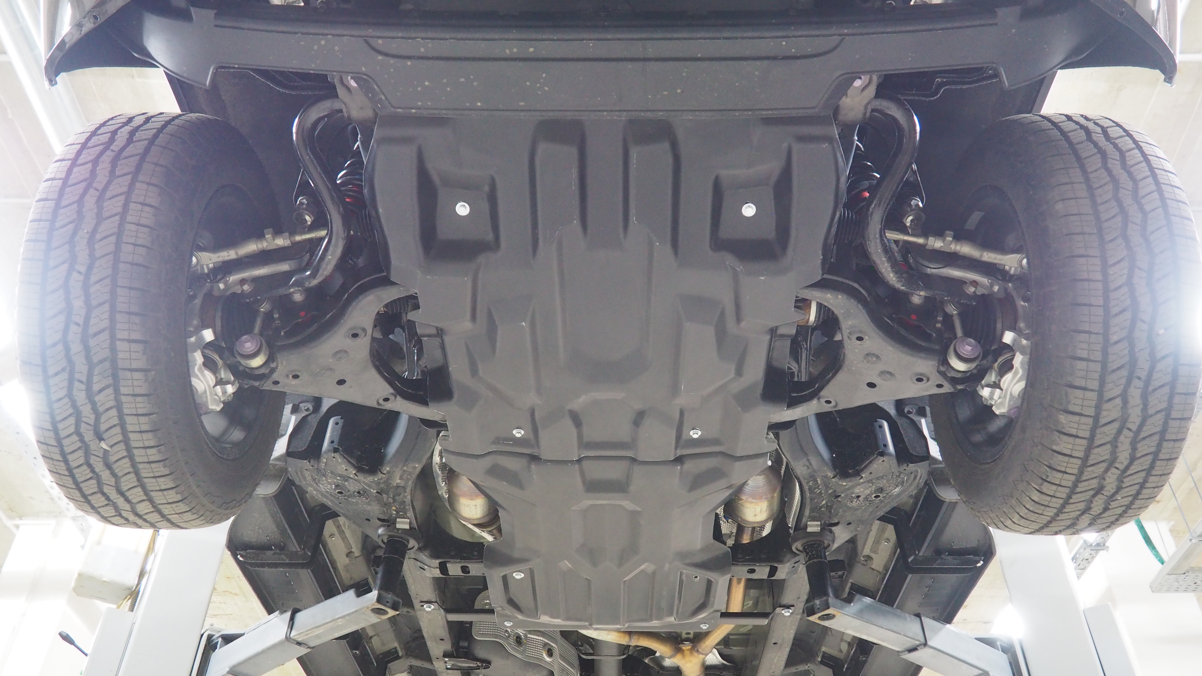 Композитная защита, в 1,5 раза превосходит сталь по прочности. Благодаря сканерной технологии изготовления снижение клиренса минимально. В сравнении с металлической защитой при наезде на препятствие не получает остаточную пластическую деформацию, после которой возможно повреждение элементов моторного отсека автомобиля таких как картер, выхлопная труба или катализатор. Температурный режим эксплуатации защиты от + 120С до -60С.